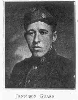 Jennison Guard, son of Curtis and Jeanette Jennison Guard, entered the National Army as a private in June 1918. After a training period of about four months in a Depot Brigade at Camp Sherman, he was transferred to Evacuation Hospital Unit No. 28, a company of about 230 men. this company embarked on the George Washington and arrived at Brest, France on November 9, 1918.
