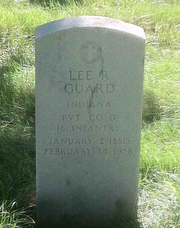 Lee R. Guard was born January 2, 1880 in Indiana, and died February 14, 1958 in the Veterans Administration Hospital in Grant, Marion, Indiana, at the age of 78. His usual residence was in Linden, Montgomery, Indiana, on a farm outside the city limits. His occupation was farmer. His father was Timothy Guard, and his mother was Mary I. Powers. Lee served in the military from 3/27/05 to 3/2/08. Cause of death was bronchopneumonia, bilateral, duration 4 days. He is to be buried 2/17/1958 in VA Cemetery, Marion, Indiana.