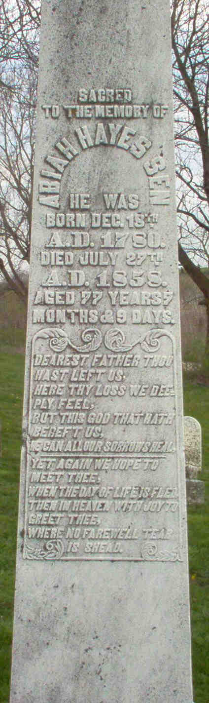 ABIAH HAYES was born December 18, 1780, in Washington County, Penn., where he continued to reside until near his twentieth year, when he removed to the Big Bottom, where his grandfather (Joseph HAYES), and four of his uncles, had settled some years previously. He located in the valley of the Big Miami, not far from where Thomas Miller, Sr., first settled. Here he invested all his money in the purchase of two and one tenth acres of land, whereon he reared his log cabin. This two and one-tenth acres formed the nucleus of his future fortune. With untiring energy and perseverance, which he possessed in a high degree, he made thirty-three trading voyages to New Orleans, and sixteen times returned home on foot, through the Indian nations, and once he went around by sea with his cargo, which he disposed of at Norfolk, Va., Alexandria and Georgetown, D.C., returning home by Washington and Brownsville, paying a visit to the place of his nativity and burial place of his father, thence from Pittsburgh, by the Ohio River home. Thus at the age of fifty-five years, he had become the richest man in Dearborn County. He was cool and collected, never suffering himself to be carried away by passion, he seemed to meditate much, and converse sparingly and never was taken at a nonplus. During the war of 1812 Mr. HAYES belonged to what was called the Rangers, served one trip around by Brookville, Pipe Creek, and the head of Tanner's Creek. Seeing no enemy they returned home. Maj. McHenry was the captain; Mr. HAYES hired a substitute to finish his term of service, thus bidding adieu to the profession of arms. Mr. HAYES raised a large family, seven of whom lived to womanhood and manhood and were married. But three of them survive him -- two sons and one daughter. About eight years since he lost his wife, the companion of his youth. Some four or five weeks passed, he complained of a pain in the side of his face, which was supposed to be a boil; it grew worse and broke. On Monday the 19th Samuel Morrison and Henry Hardin visited him; he conversed freely and sensibly with them, recounting the reminiscences of the past as vividly as though they had just transpired; he retained the full enjoyment of his mental faculties to the last. He was taken with a congestive chill on Monday the 26th (having had two chills previously) which terminated his pilgrimage on earth. He died at the residence of his son, Abiah HAYES, Jr., in the vicinity of Hardinsburg, July 27, 1858, in the seventy-eighth year of his age. His funeral sermon was preached by Rev. E. D. Long, attended by two other clergyman, at the Bellevue Methodist Episcopal Church, to a very large audience, among whom were to be seen pioneers Judge Isaac Dunn, who has been in the Miami Valley over sixty-nine years; Job Miller and his sister-in-law Sarah Miller, over sixty-eight years; Bailey Guard, sixty-seven years; Thomas Miller, Joseph HAYES, Walter HAYES, Jesse Hunt, Thomas Hunt, over sixty years; Jonathan Blasdall, Elizabeth Blasdall, John Cullahan, fifty-five years, and Samuel Morrison, a native of the county of Dearborn, born in 1796. Thus another of our number has been called away. Peace be to his sleeping dust. He has felled the last oak, reared the last log cabin, plowed his last furrow, his corn is laid by, his harvest is passed, he sleeps his last sleep.