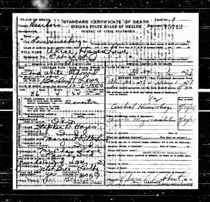 Alice Hayes Lowe was born December 6, 1850 in Ohio, and died May 1, 1937, in Lawrenceburg city, Dearborn county, Indiana at the age of 86 years, 4 months and 24 days. A white female widow of Bailey H. Lowe, she lived on E. High St. in Lawrenceburg, and her occupation was domestic [housewife]. Her father was Stephen B. Hayes of Indiana, her mother Margaret Rittenhouse of Indiana. The informant was Mr. Chas. Lowe of Lawrenceburg, Indiana [her son]. She died of cerebral hemorrhage, with contributory acute myocarditis. She is to be buried in Greendale cemetery by the Fitch Bros undertakers.