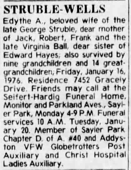 Edythe A., beloved wile of the late George Struble, dear rnother of Jack, Robert, Frank and the late Virginia Ball, dear sister of Edward Hayes, also survived by nine grandchildren and 14 great-grandchildren; Friday. January 16, 1976. Residence 7452 Gracely Drive. Friends may call at the Seifert-Hardig Funeral Home,