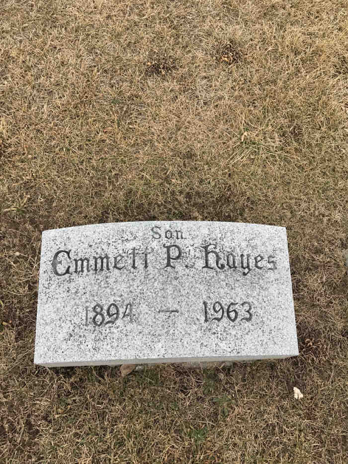 Emmett Perry Hayes was born May 24, 1894 in Washington, Iowa. A caucasian male, retired dairyman in the dairy industry, his social security number was 481-42-4500. He was not a veteran. He was married. Informant was Mabel Schocley, 519 N. Ave D, which was also his listed residence His father was Perry Hayes, his mother was Lillie Kensler. He died March 11, 1963 at the age of 68 in Mercy Hospital, Iowa City, Johnson county, Iowa. Cause of death was carcinoma of the colon due to carcinomatosis, no autopsy performed. Burial to take place March 14, 1963 in Elm Grove Cemetery in Washington, Iowa.