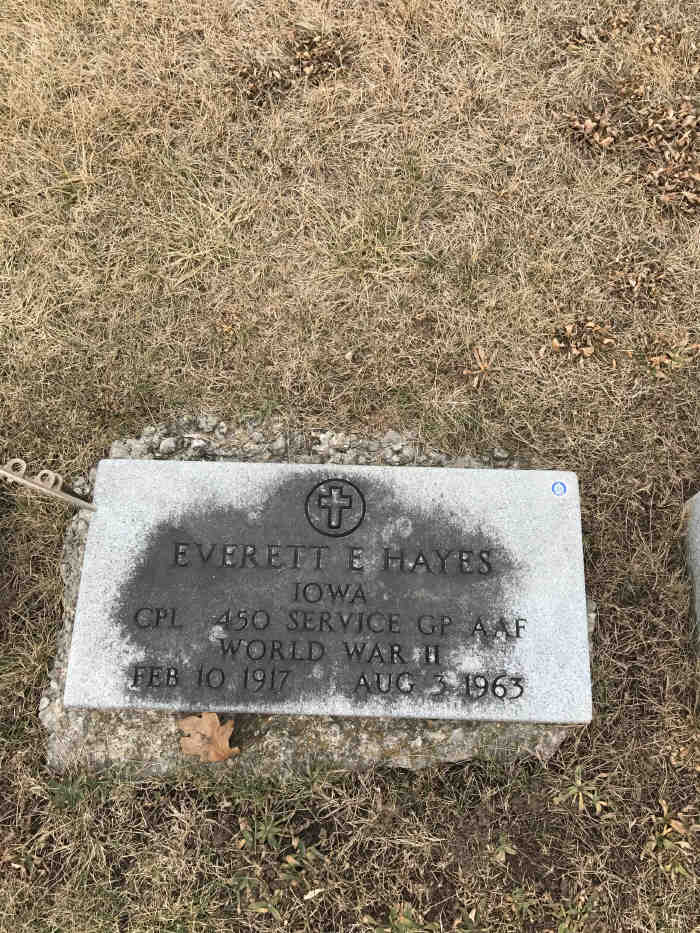 Everett Emmet Hayes was born February 10, 1917 in Washington, Iowa. A white male, his occupation was foreman. He resided at time of death at Box 457, Farmington, Van Buren, Iowa. He died in the VA Hospital in Iowa City, Johnson county, Iowa on August 3, 1963 at the age of 46, after a 3 day stay. He was a member of the U.S. Armed Forces during WWII. His SSN was 478-32-8276. His father was Mr. Emmett Hayes, his mother was Mrs. Ninn Godwin / Mrs Everett Hayes. Cause of death was lobular pneumonia, severe, bilateral due to multiple sclerosis. His physician was W. J. Powers, M.D. Burial to take place Aug 5, 1963 in Elm Grove Cemetery, Washington, Iowa.