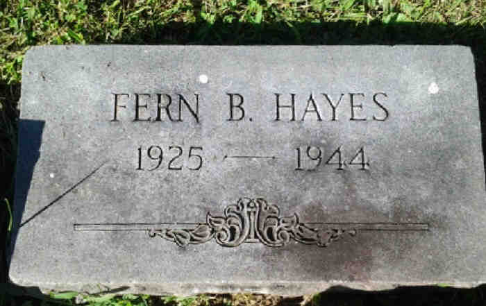 HAYES\emdash Fern B. Hayes. age 18 years. beloved daughter of Walter M. and Hattie F. Hayes (nee Hughes), Wednesday, September 6. 1944, at residence, 21 Jefferson, Newtown. Ohio. Services at Church of God,