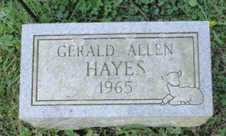 Gerald Alan Hayes was born and died 8/26/1965 at St. Francis Hospital in Beech Grove, Marion, Indiana. His parents, David Ross Hayes and Ruth Ilene Fulaytar resided at 1405 Brunswick in Indianapolis. Cause of death was atelectasis, bilateral (collapse of the lungs). He also had congenital polycystic kidneys (fluid filled cysts in the kidneys). Burial is to take place 8/28/1965 in Moravian cemetery in Hope, Indiana.