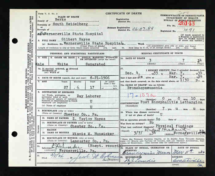 Gilbert Hayes, a white separated male, was born 8/21/1606 in Chester county, Pennsylvania, and died 3/7/1934 in Wernersville State Hospital, South Heidelberg, Berks, Pennsylvania, at the age of 27 years, 6 months, 17 days. His occupation was day laborer. His father was Z. Taylor Hayes, born in Chester county, Pa. His mother was Minnie M. Hunsicker, born in Lancaster county, Pa. Informant was E. J. Schroeder from hospital records. Cause of death was bronchopneumonia with contributory post encephalitis lethargica. Burial to take place 3/11/1934 in Brandywine Manor.