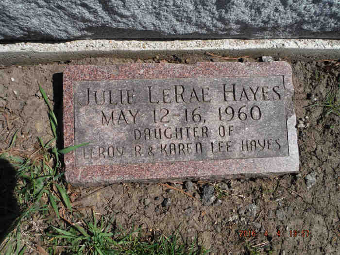 Father: Leroy Raymond Hayes {Find A Grave ID: 280979901} Mother: Karen Lee Warman {Find A Grave ID: 213031011}