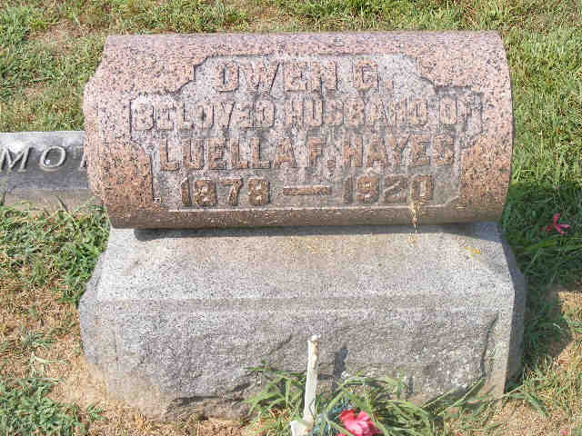 Owen Hayes, a white male, occupation farmer, married to Luella Hayes born Dec. 8, 1878 in Ohio, father was Ezra G. Hayes of Ohio, mother was Arabella West of Ohio. Attending doctor who signed the death certificate was Dr. Palmer of 757 Race St. Owen died on July 23, 1920 in Christ Hospital Cincinnati, Hamilton, Ohio, of acute gangrenous appendicitus, and general peritonitis of 4 days duration. Informant was Ezra G. Hayes of Cleves, Ohio. Undertaker was Argo Bros of Cleves, Ohio. Burial July 26, 1920 in Greendale, Ind.
