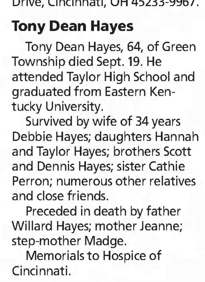 Tony Dean Hayes, 64, of Green Township died Sept. 19. He attended Taylor High School and