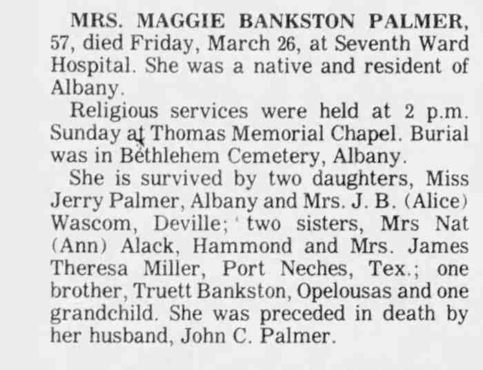 She is survived by two daughters, Miss Jerry Palmer, Albany and Mrs. J. B. (Alice) Wascom, Deville; two sisters, Mrs Nat (Ann) Alack, Hammond and Mrs. James Theresa Miller, Port Neches, Tex.; one brother, Truett Bankston, Opelousas and one grandchild. She was preceded in death by her husband, John C. Palmer.