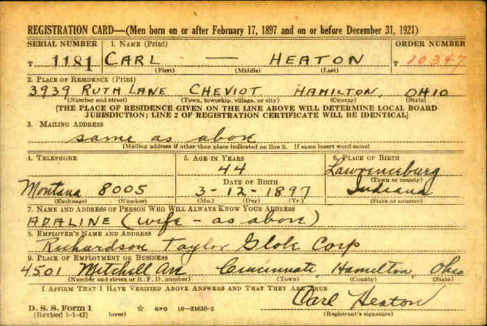 Carl Heaton is 44 years old, born 3-12-1897 in Lawrenceburg, Indiana. He resides at 3939 Ruth Lane, Cheviot, Indiana, and his phone number is Montana 8005. The person who will always know his address is his wife, Adaline, same address. His employer is Richardson Taylor Globe Corp, 4501 Mitchell Ave., Cincinnati, Hamilton, Ohio. Carl is described as 5'11" tall, 182 lbs, white race, brown eyes, black hair, dark complexion, and has 3 toes partially off his right foot.