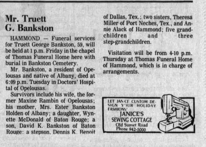 Birth Date: 12 Dec 1924 - Albany, Livingston, Louisiana, United States 1 Christening: Death: 20 Nov 1984 - Doctors' Hospital, Opelousas, Saint Landry, Evangeline, Louisiana, United States ( at age 59) 1 Burial: 23 Nov 1984 - Bankston Cemetery, North Albany, Livingston, Louisiana Cause of Death:Events